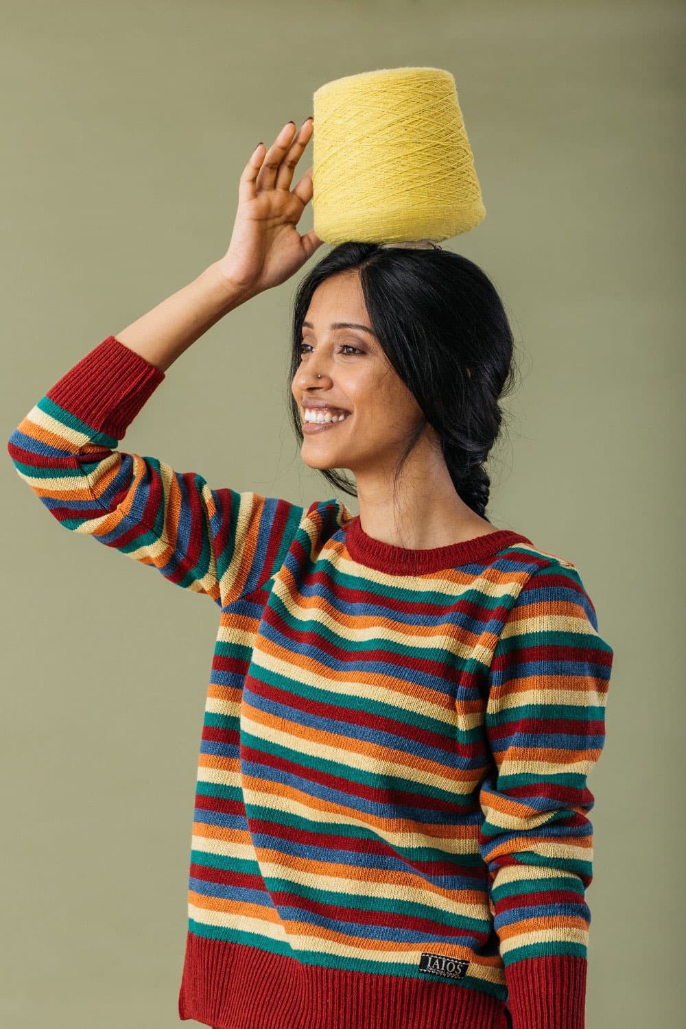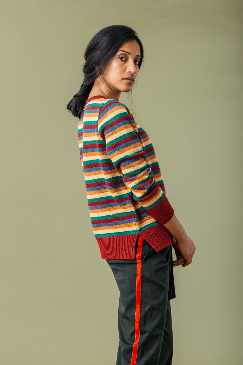 El jersey de rayas multicolor es una prenda sostenible fabricada en talleres locales y de proximidad en el área de Barcelona.